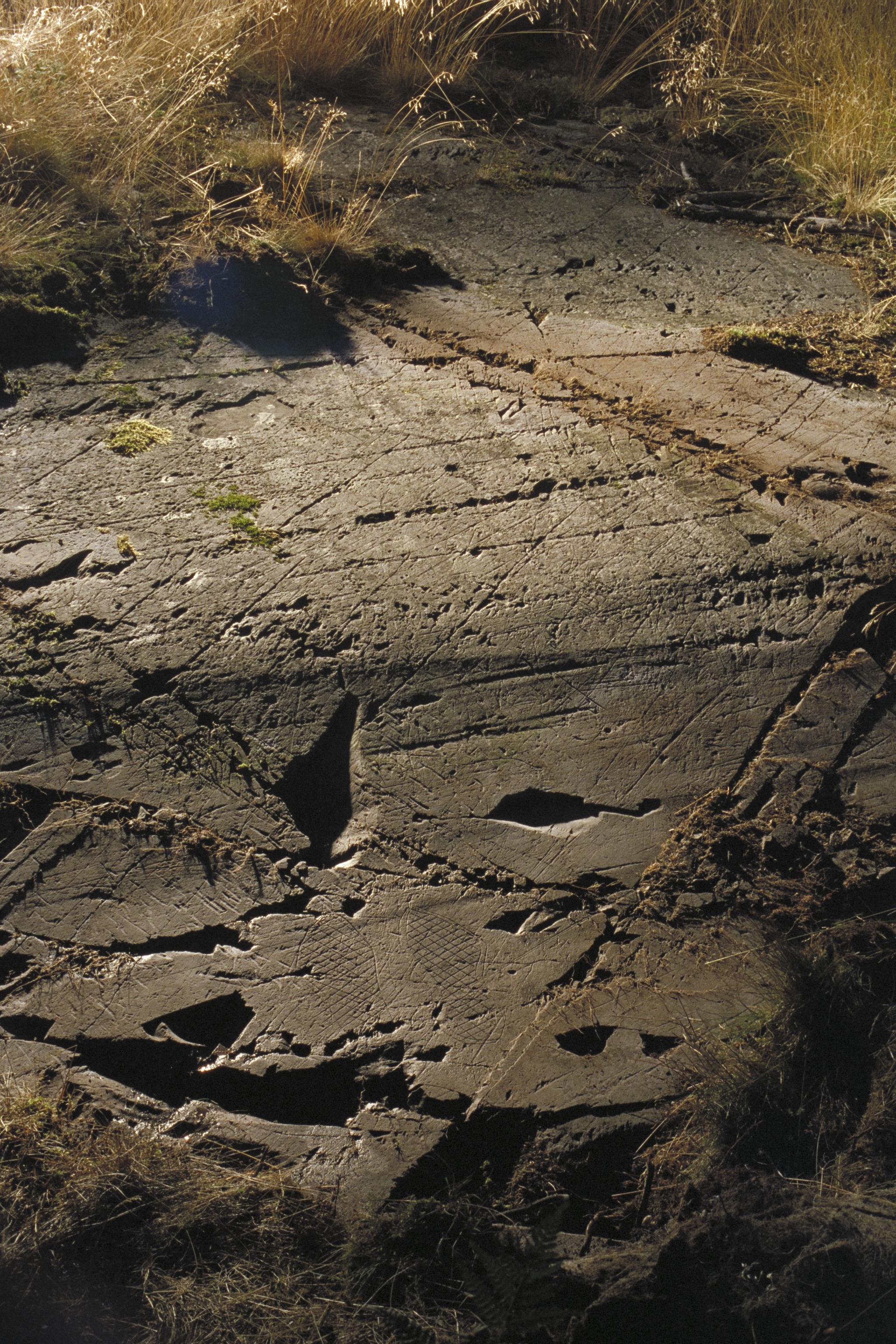 RAÄ-nummer Tisselskog 7:3. Skurna fotfigurer med rutmönster, troligen moderna ristningar.