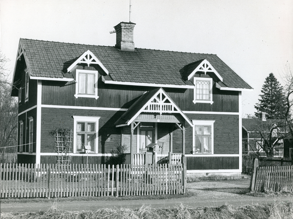 Spaljé på väggen, staket och fågelmatning framför huset.