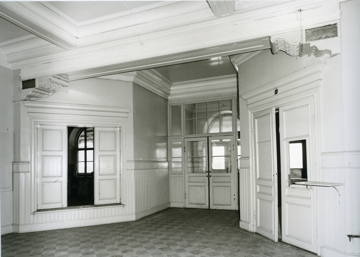 Snytens järnvägsstation, interiör med dörrar och detaljer i taket, 1971.