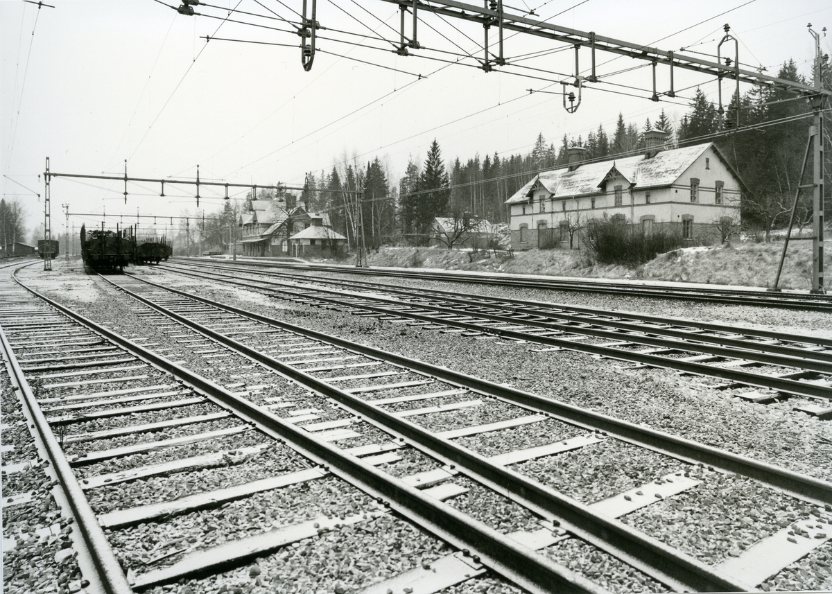 Snytens järnvägsstation, större byggnad på stationsområdet till höger plus järnvägsspår, 1971.