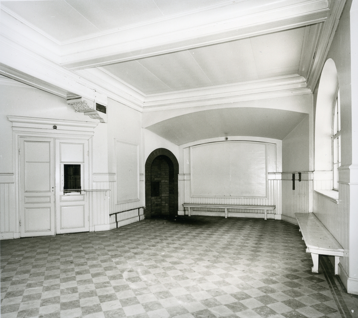Snytens järnvägsstation, interiör med dörrar och detaljer i taket, bänkar, rutigt golv, 1971.
