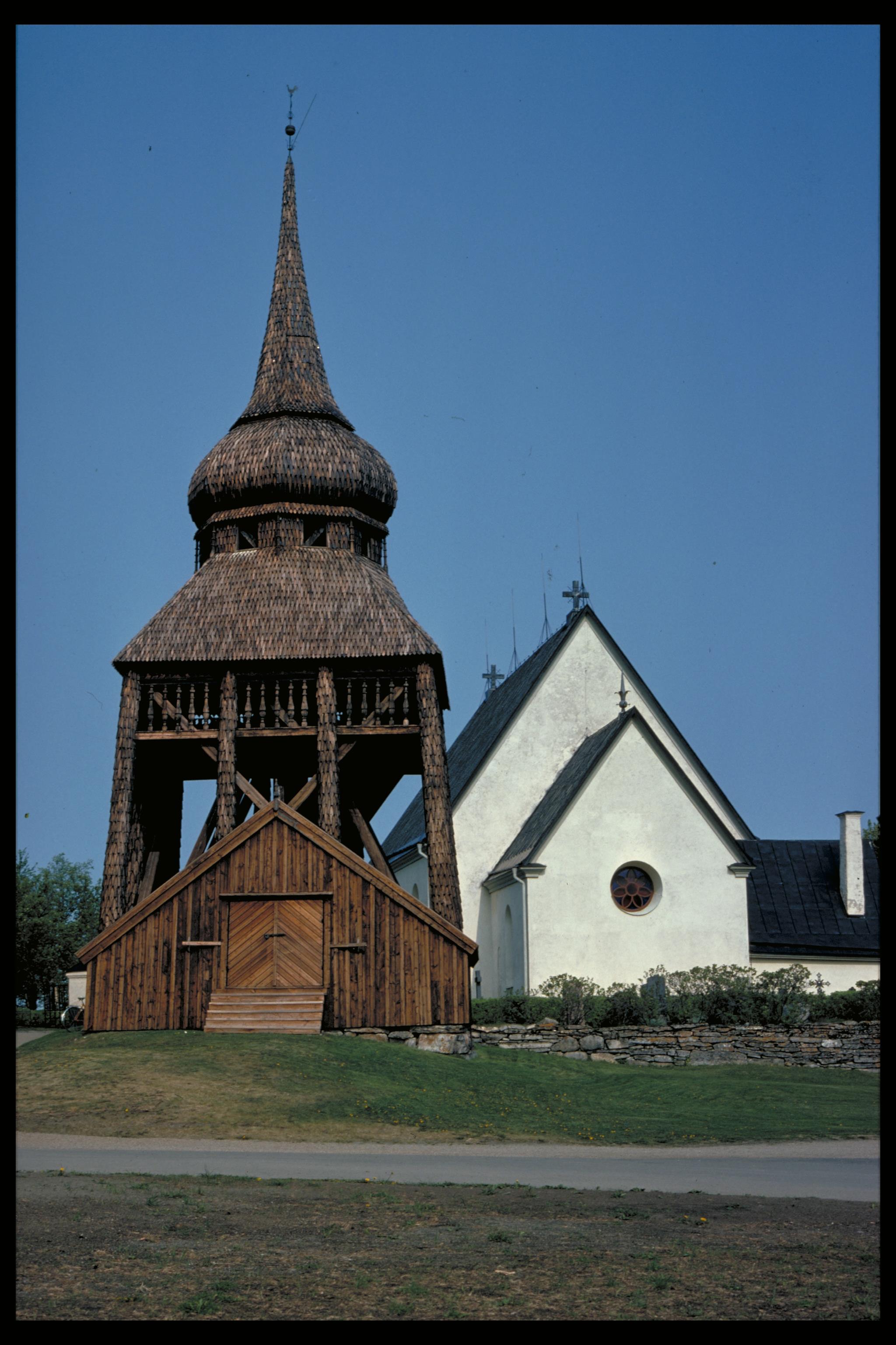 Kyrkan från öster med klockstapeln. Bilden troligen från mitten av 1970-talet.