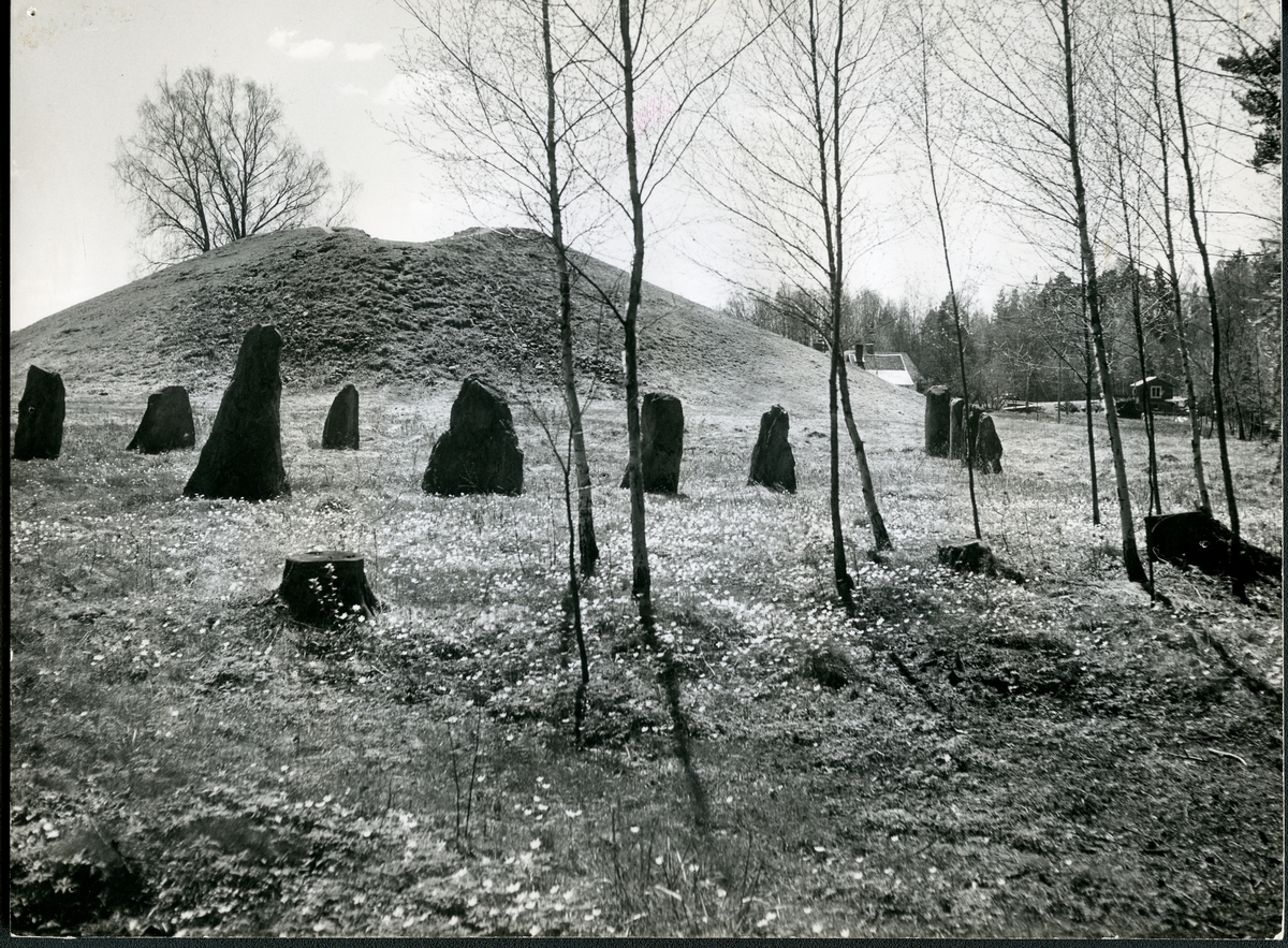 Anundshögen och del av stora skeppssättningen med vitsipppor i förgrunden.