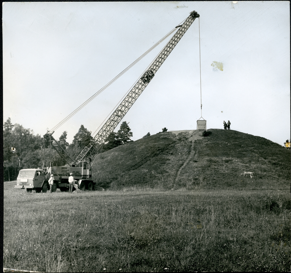 Kranbil lyfter upp något på toppen av Anundshögen.