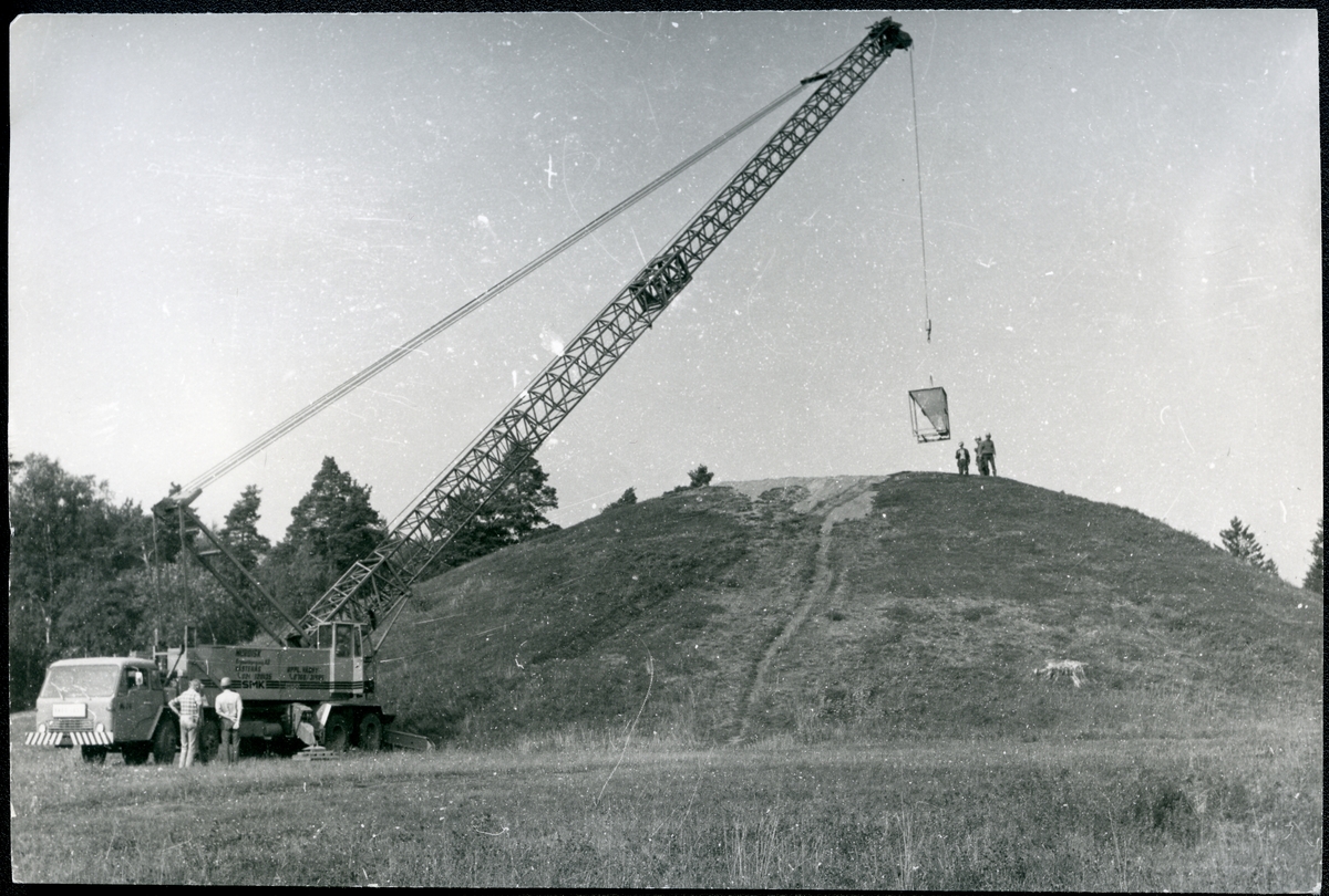 Kranbil lyfter upp något på toppen av Anundshögen.