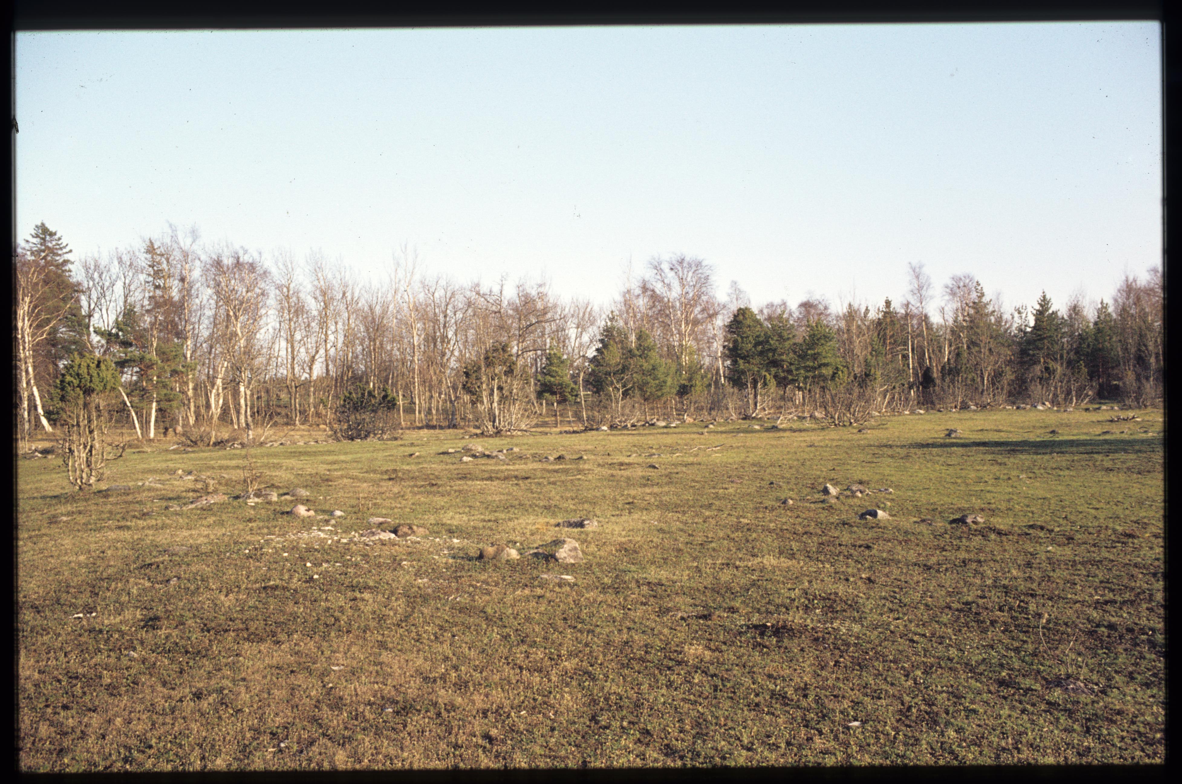 Ala 97:1. Rader av stenskodda stolphål till husgrund (riktning NÖ?).