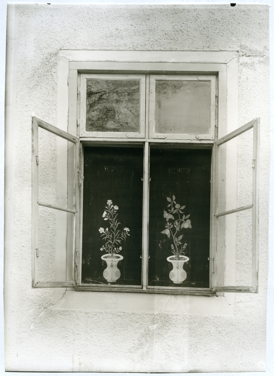 Öppet fönster med bemålade brädor på insidan, blomstermotiv. 1973.