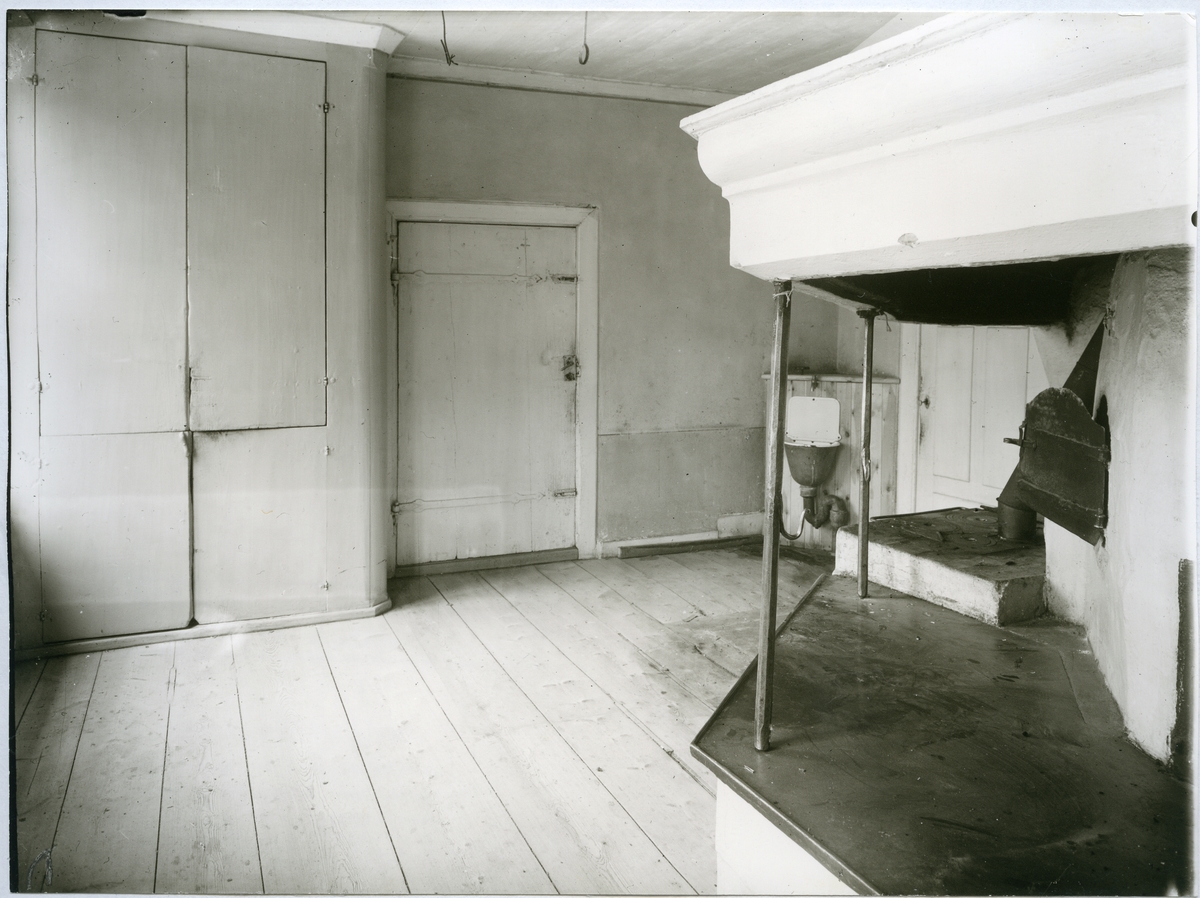 Interiör av kök, med spis och med sink i hörnet. 1973.