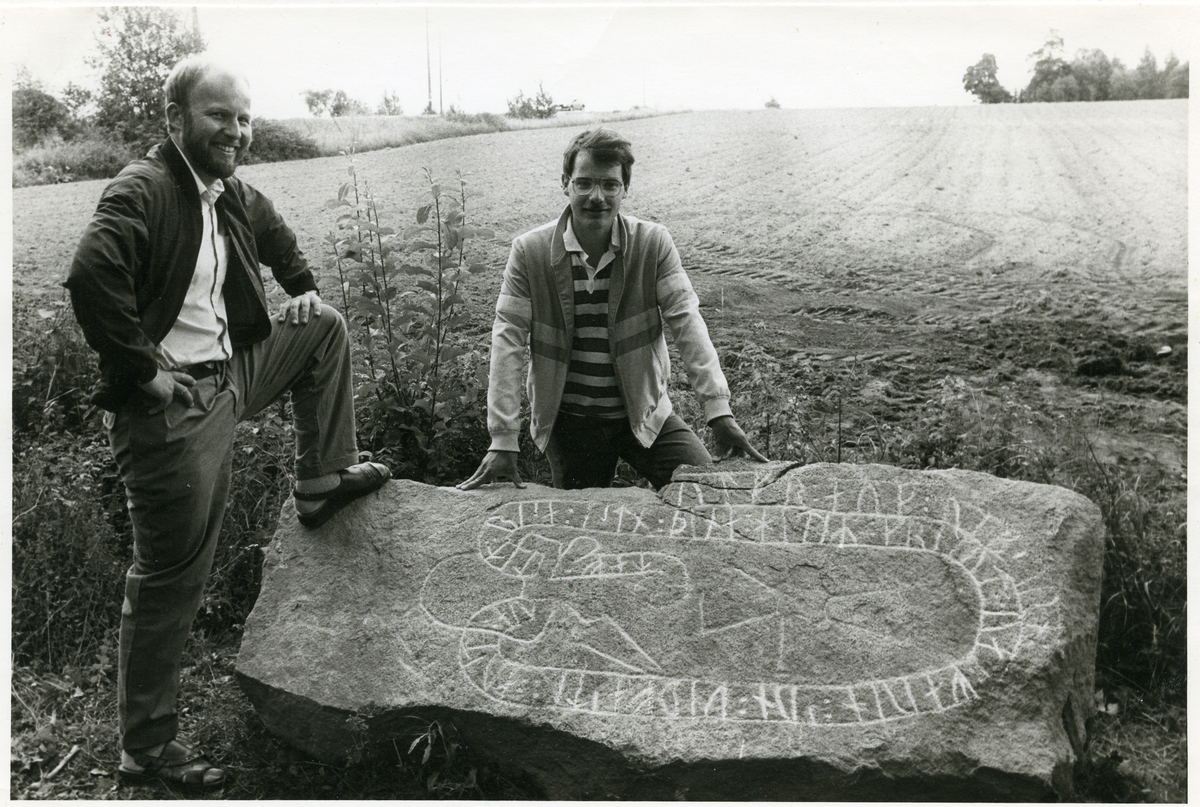 Jan Strid och Ulf Axelsson vid runstenen i Jädra, 1986.
