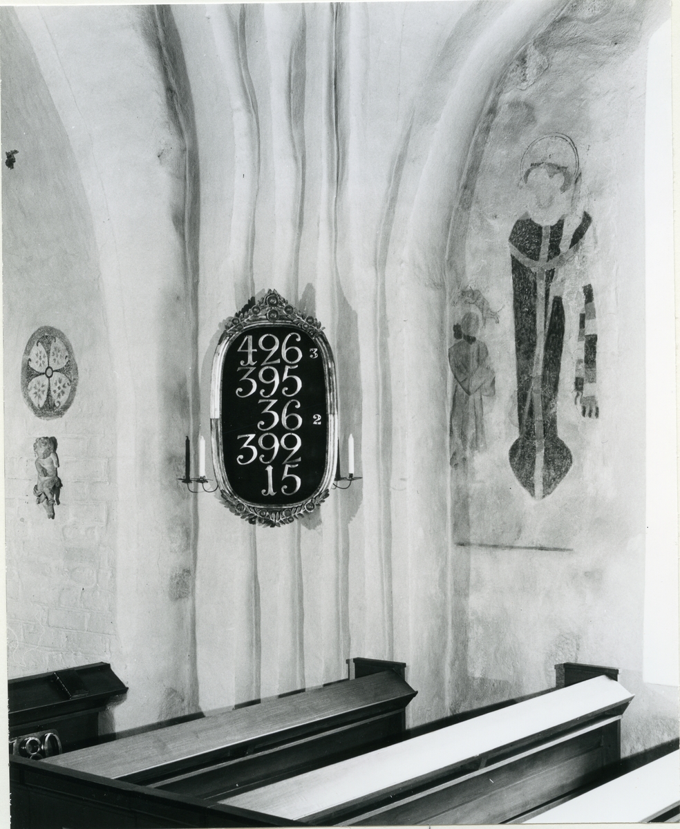 Kärrbo sn. Kalkmålning och psalmnummertavla i Kärrbo kyrka.