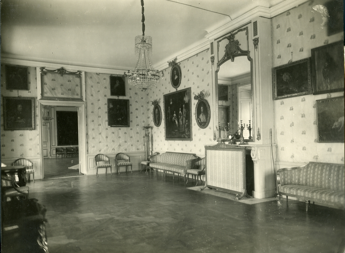 Slottets audiensrum, med soffor, kristallkrona, spegel, brasskärm, tavlor m.m.