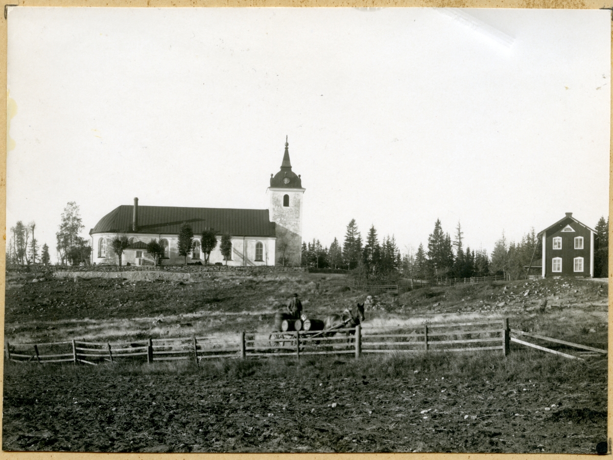 Kyrka och bostad i bakgrunden. I förgrunden åker och en man med hästkärra.