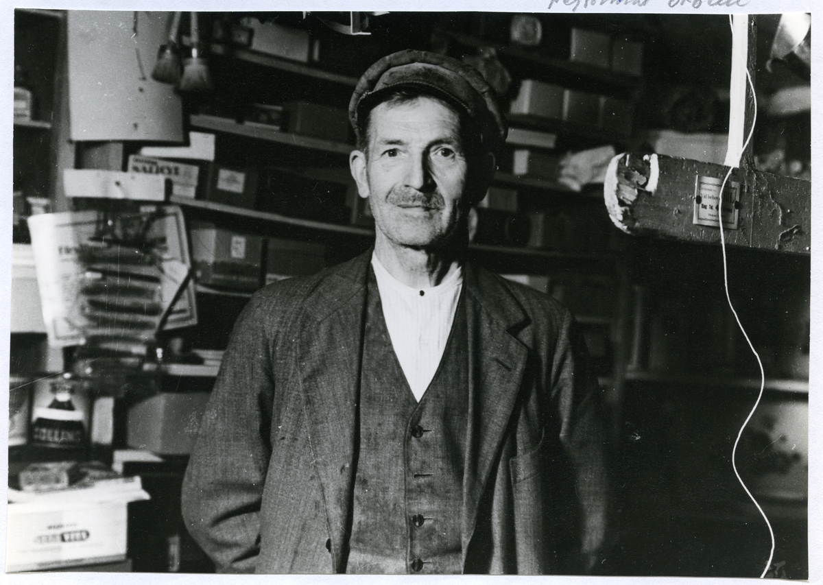 Handelsboden i Snarhem, handelsman Thorgren stående i butiken. 1940-talet?