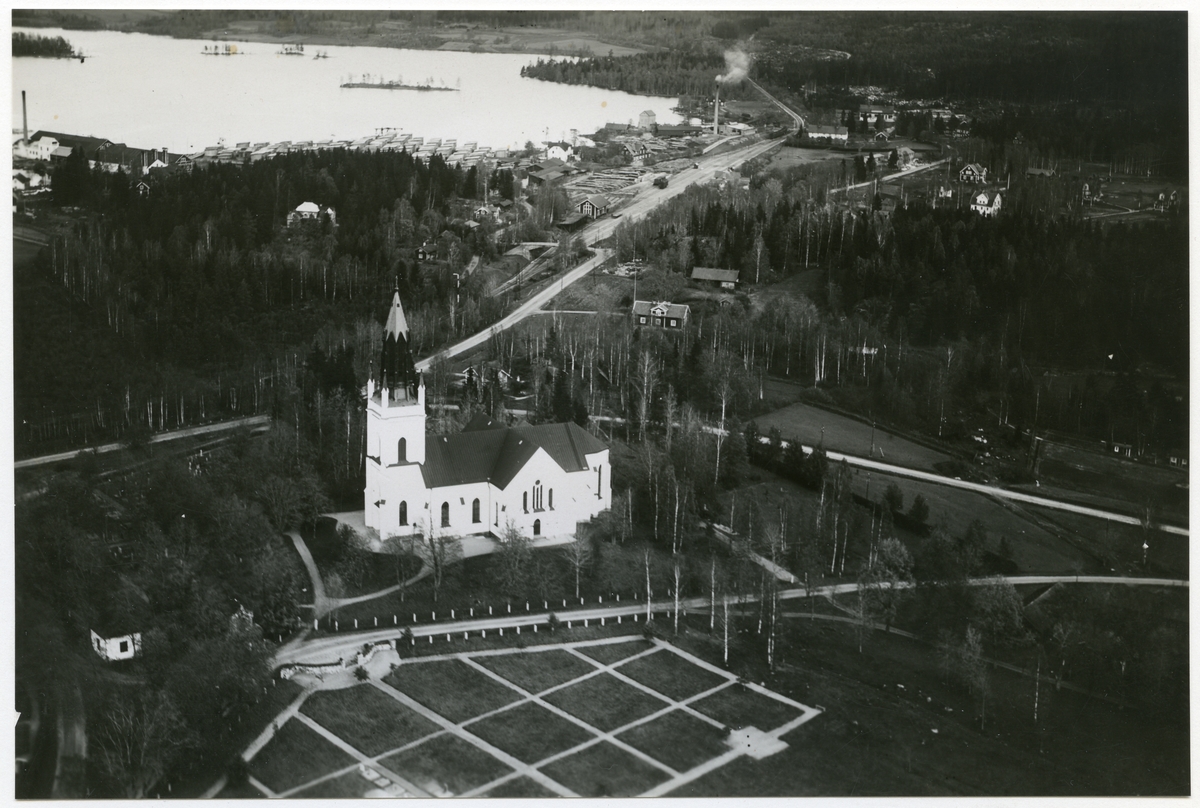 Flygfoto över Skinnskattebergs kyrka, 1932.