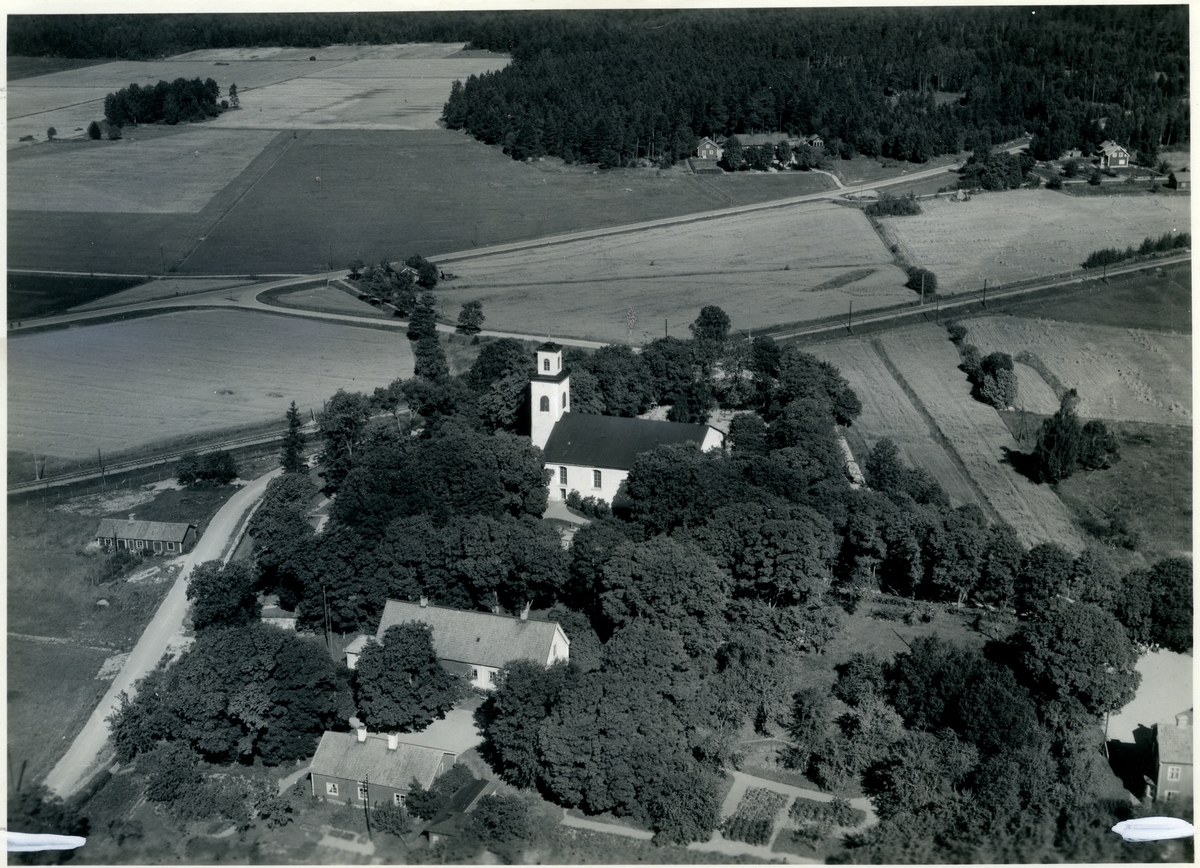 Flygfoto över Björskogs kyrka och Björskogs prästgård.