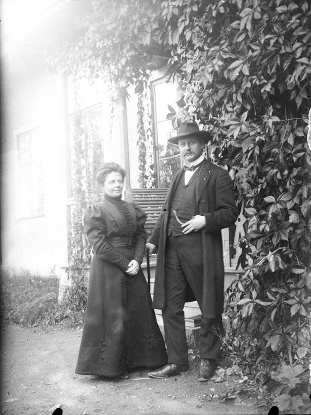 Man och kvinna utanför ett boningshus, ca 1910.