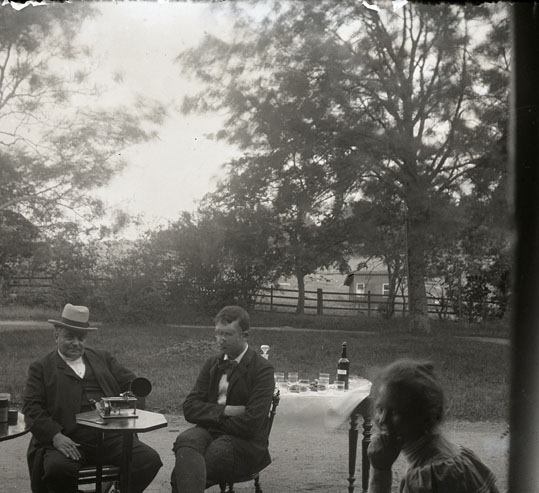 Två män i trädgård lyssnande på fonograf, Lillhärad, ca 1910.