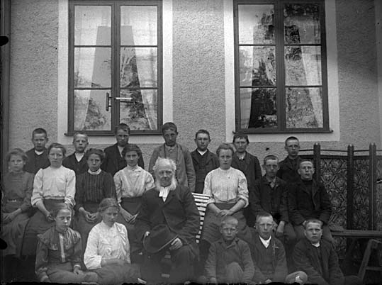 Läsbarn tillsammans med prästen framför prästgården, Lillhärad.