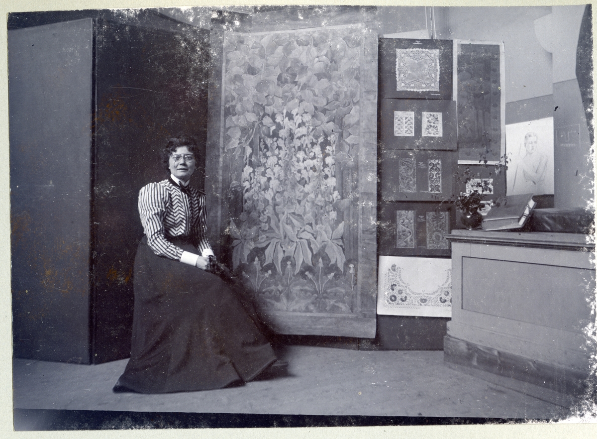 Kvinna sittande framför tavla. 1901.