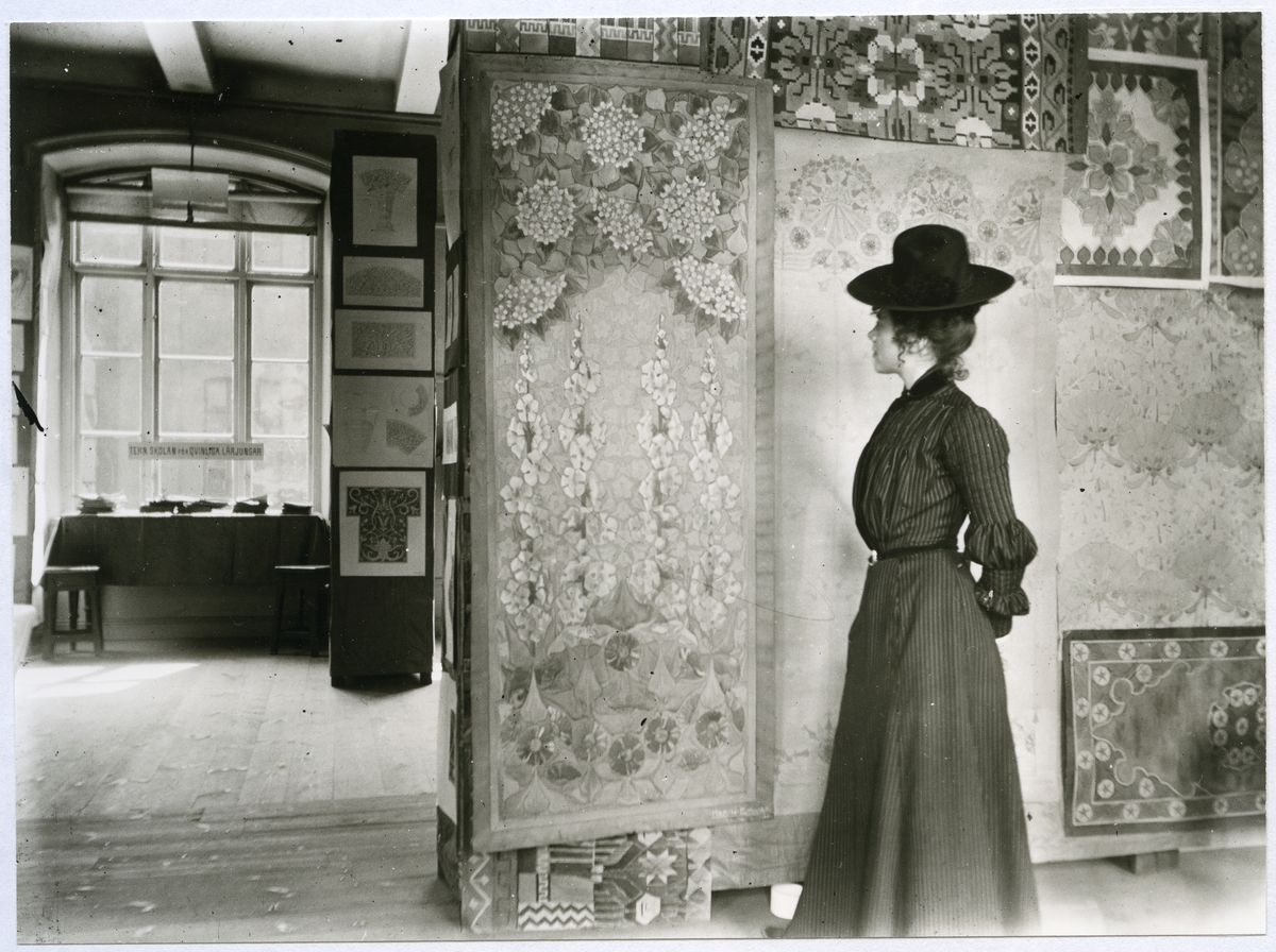 Kvinna stående framför vägg med bl.a. blomstermålningar. 1901.