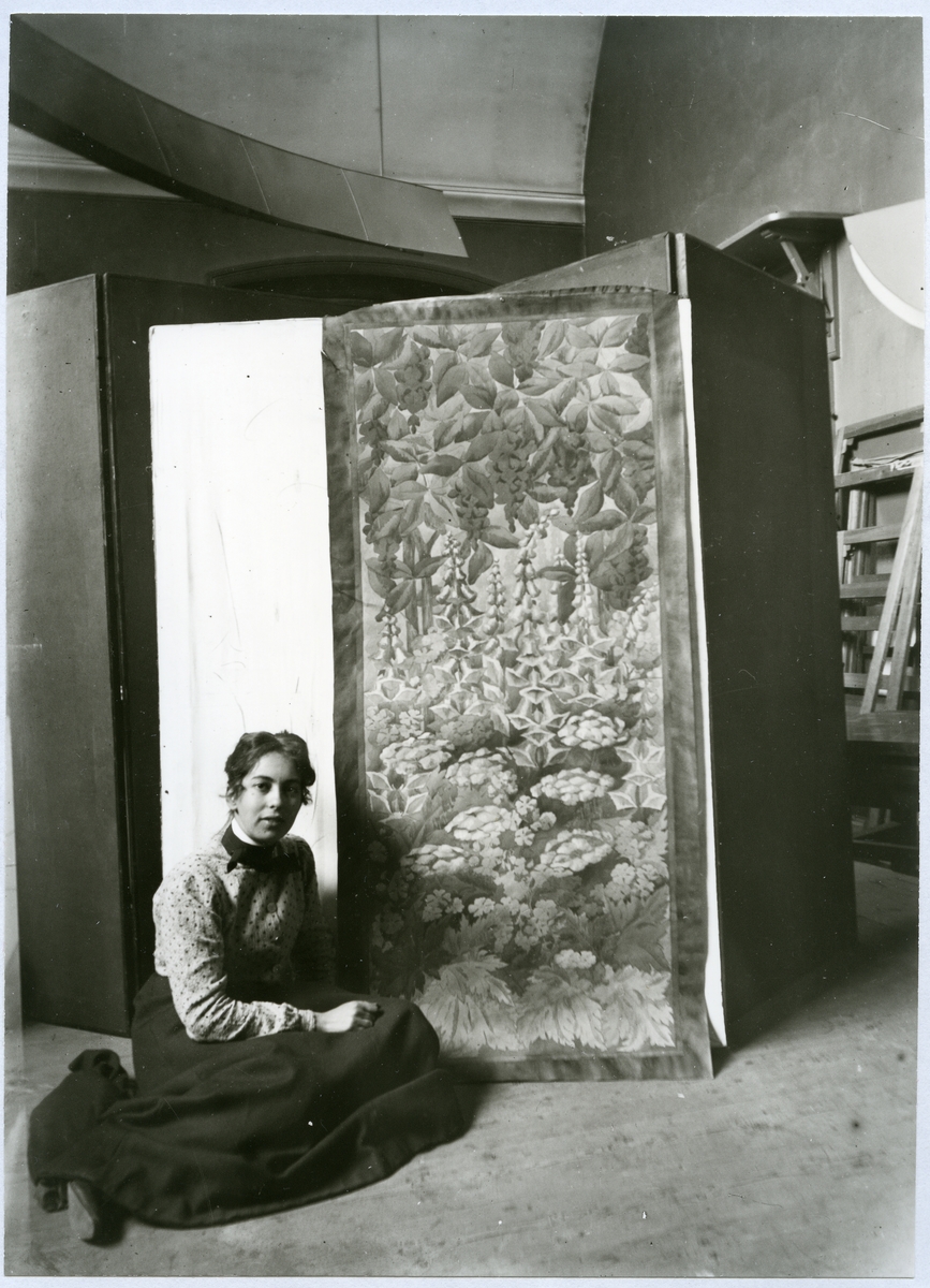 Kvinna sittande på golvet framför målning. 1901.