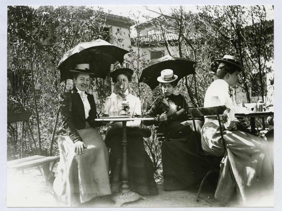 En grupp kvinnor sitter och fikar vid kafébord i trädgård. 1901.