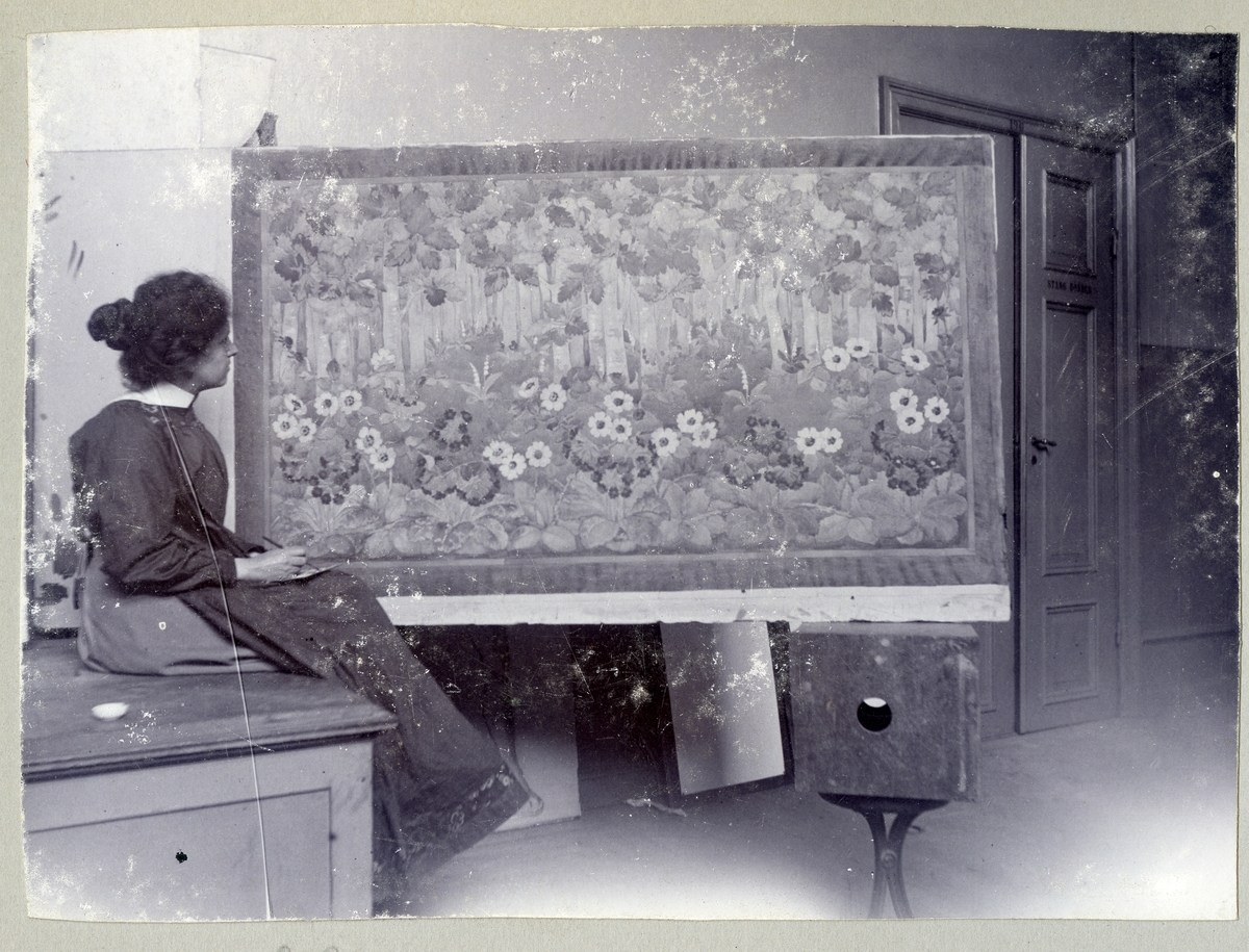 Kvinna sitter och tittar på tavla med vivor. 1901.