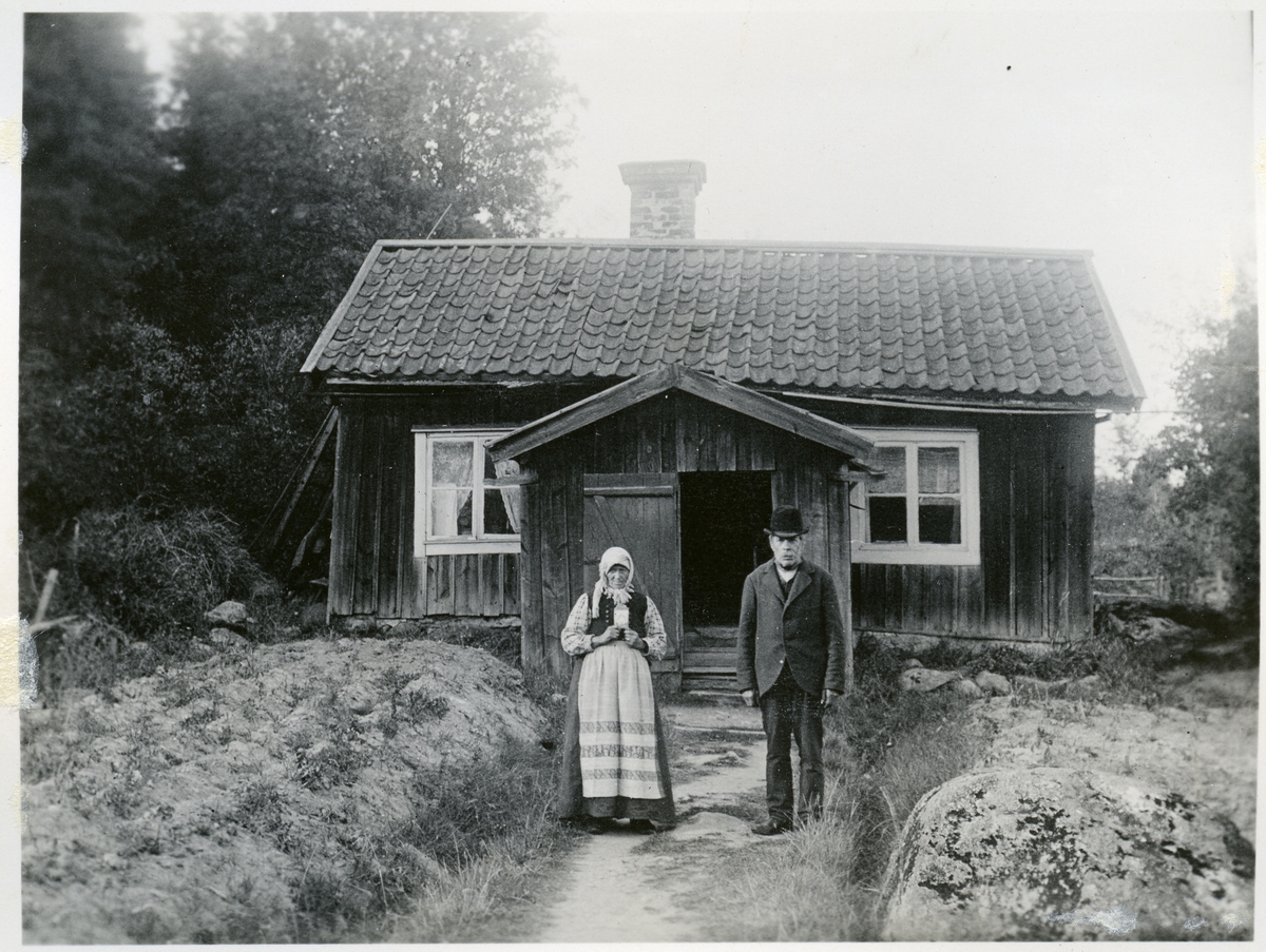 Skomakare Arrenius. Man och kvinna stående utanför bostaden. C:a 1900-1910.