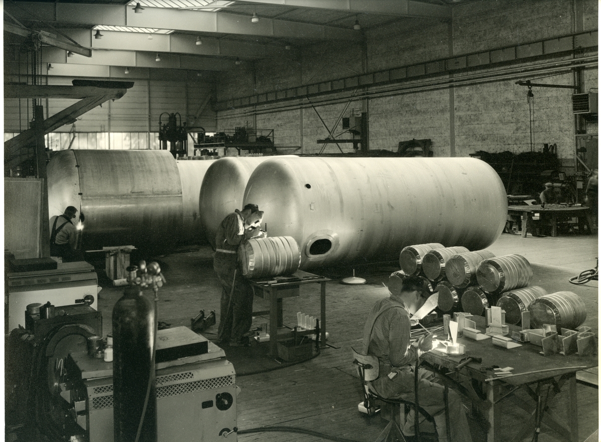 Interiör av Skultuna bruk. Män svetsar ölcisterner. 1950-tal.