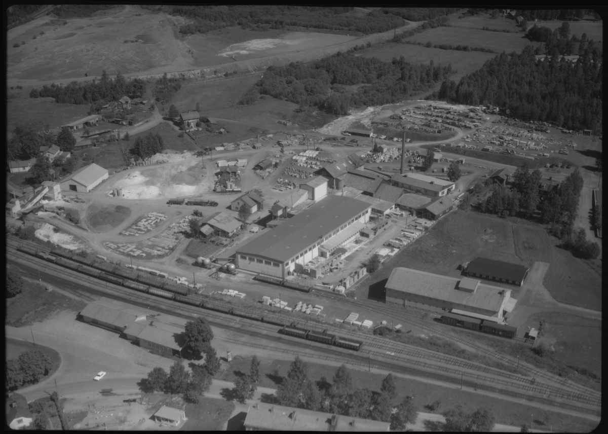 Flygfoto över Forssells cementgjuteri (trapptillverkning), Norberg.