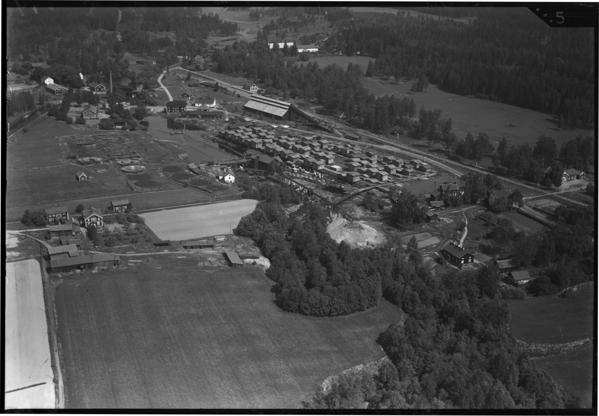 Flygfoto över Gisslarbo träindustri, Hed, Skinnskatteberg