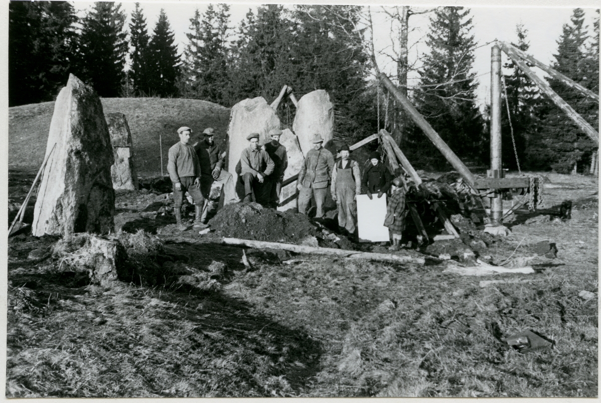 Skeppssättning under restaurering. Skeppen under resning. Arbetslag m.fl. vid stenarna. Bl.a. grundläggare Borén. 1933.