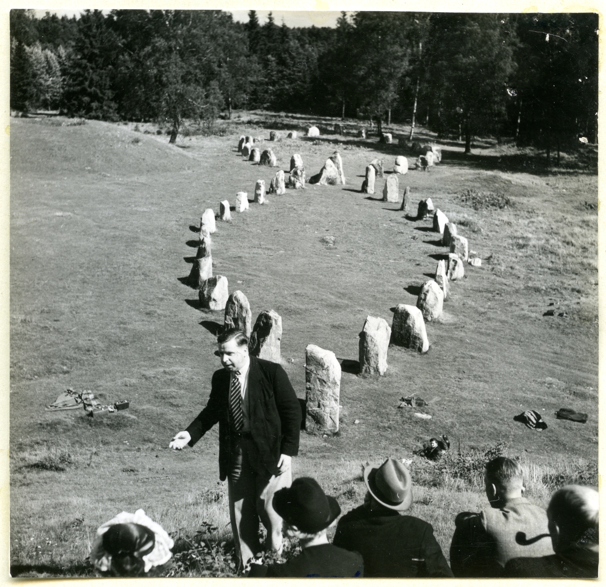 Intendent Sven Drakenberg berättar om området för publik, vid skeppssättningarna, 1938.