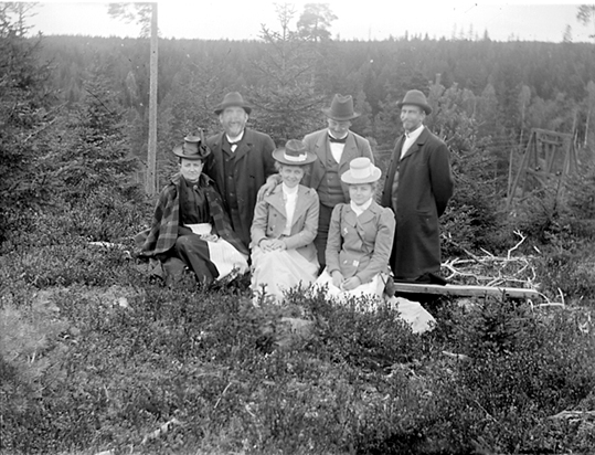 Tre herrar och tre damer i skogen, Riddarhyttan.