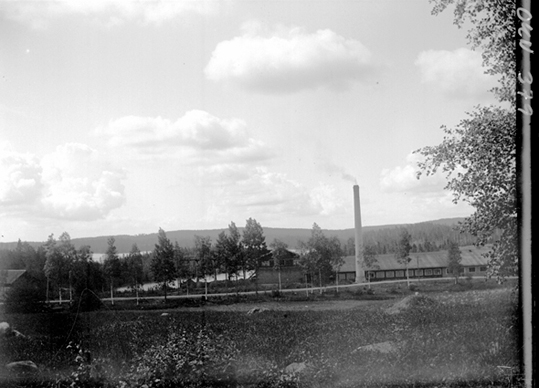 Vy med hög skorsten, låg bebyggelse. Riddarhyttan.