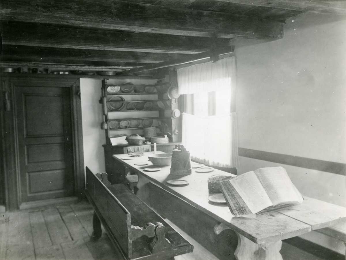 Hembygdsgården, interiör av köket med bänk dukat träbord, dörr, bok, tallrikshylla m.m.