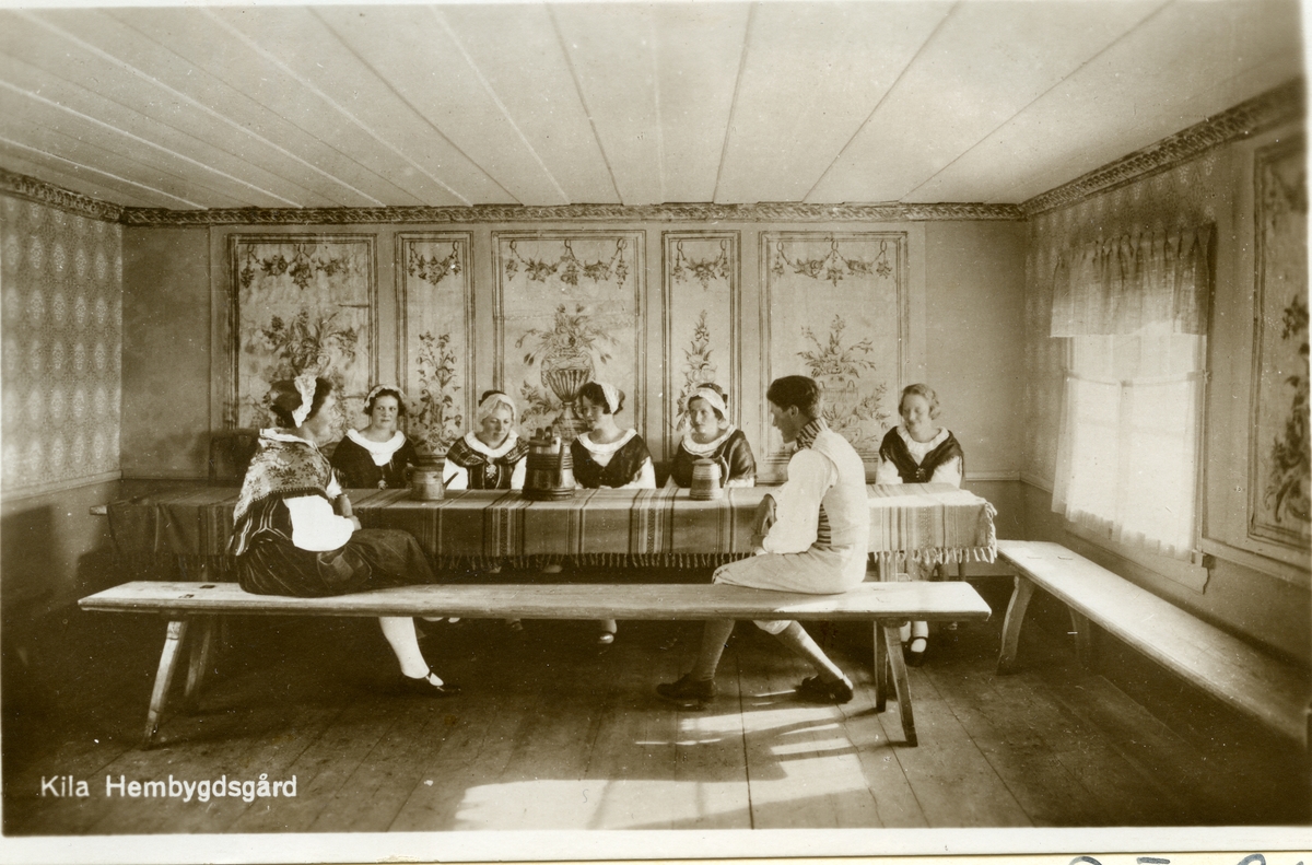 Interiör med kvinnor och man i folkdräkter sitter vid bord.