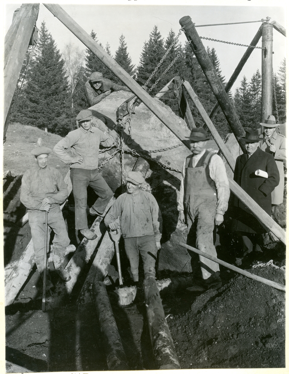 Stävstenen i stora skeppet under resning. Arbetare. 1932.