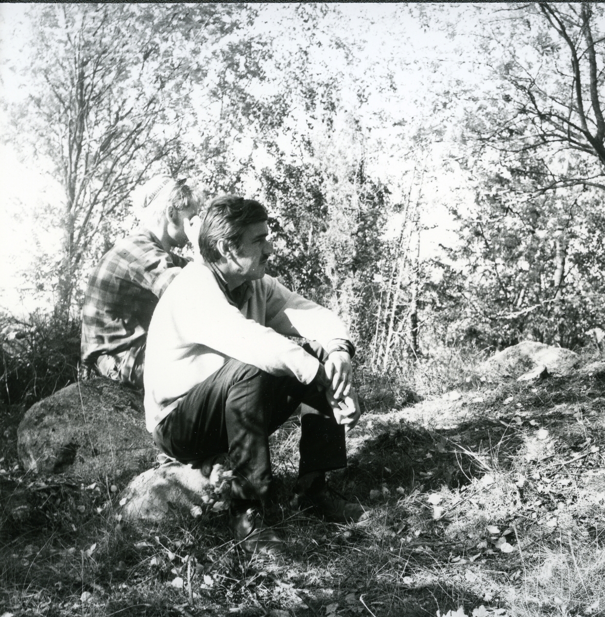 Två män sittande på sten, vid utgrävning av fornlämning,
