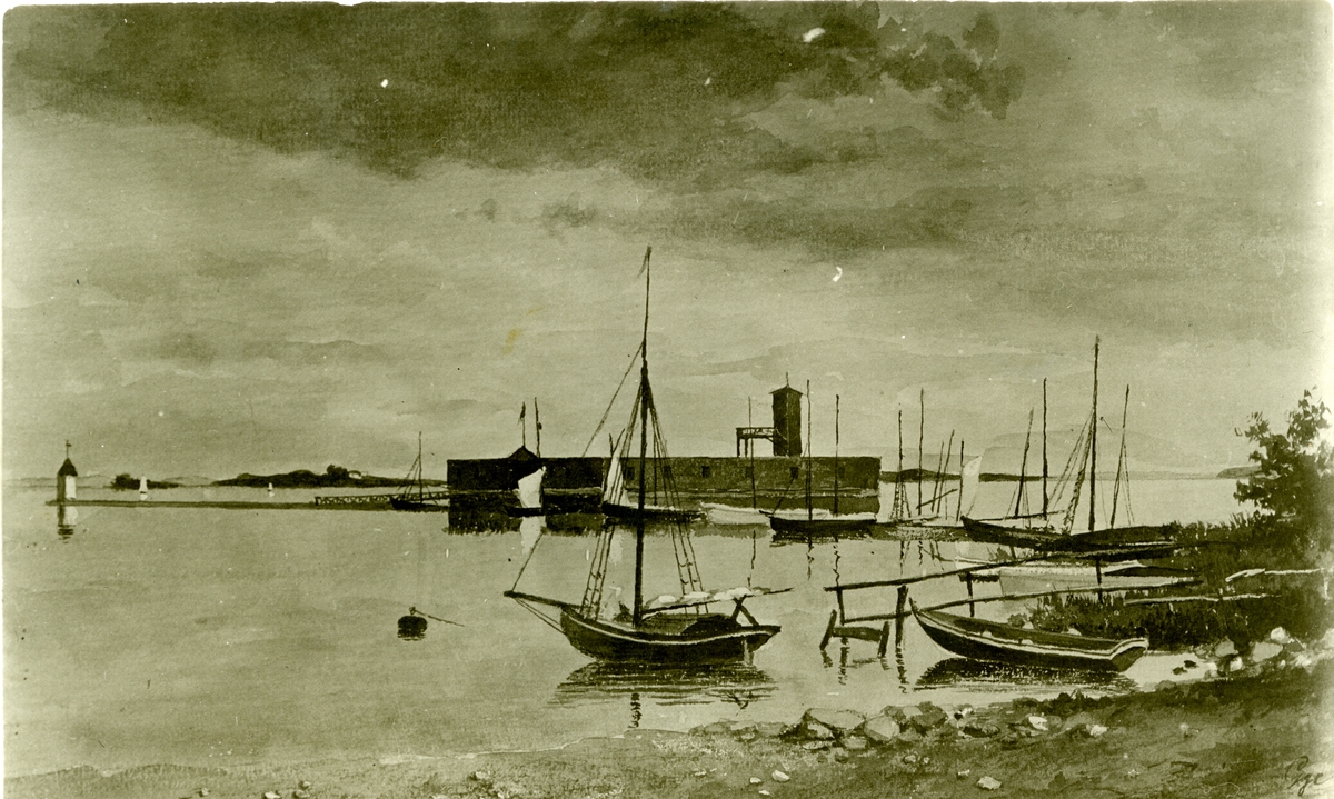 Målning av Rudolf Gagge, med gamla kallbadhuset i Västerås hamn.