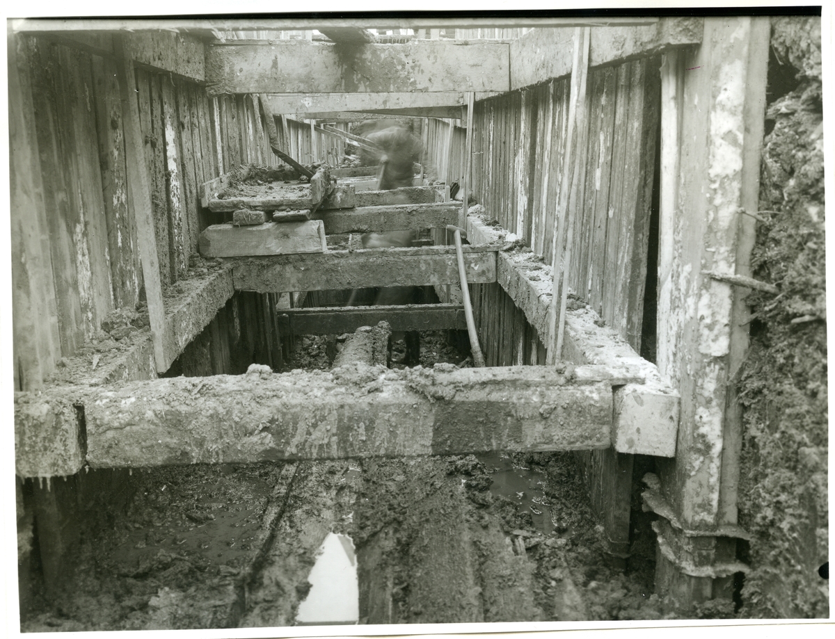 Arbetsbild från utgrävningen av båtfyndet i Gamla hamnen i Västerås, 1935.