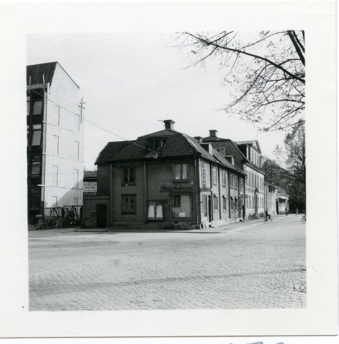 Västerås. Fiskartorget från Erik Hahrs gata mot söder med manufakturaffär och café.