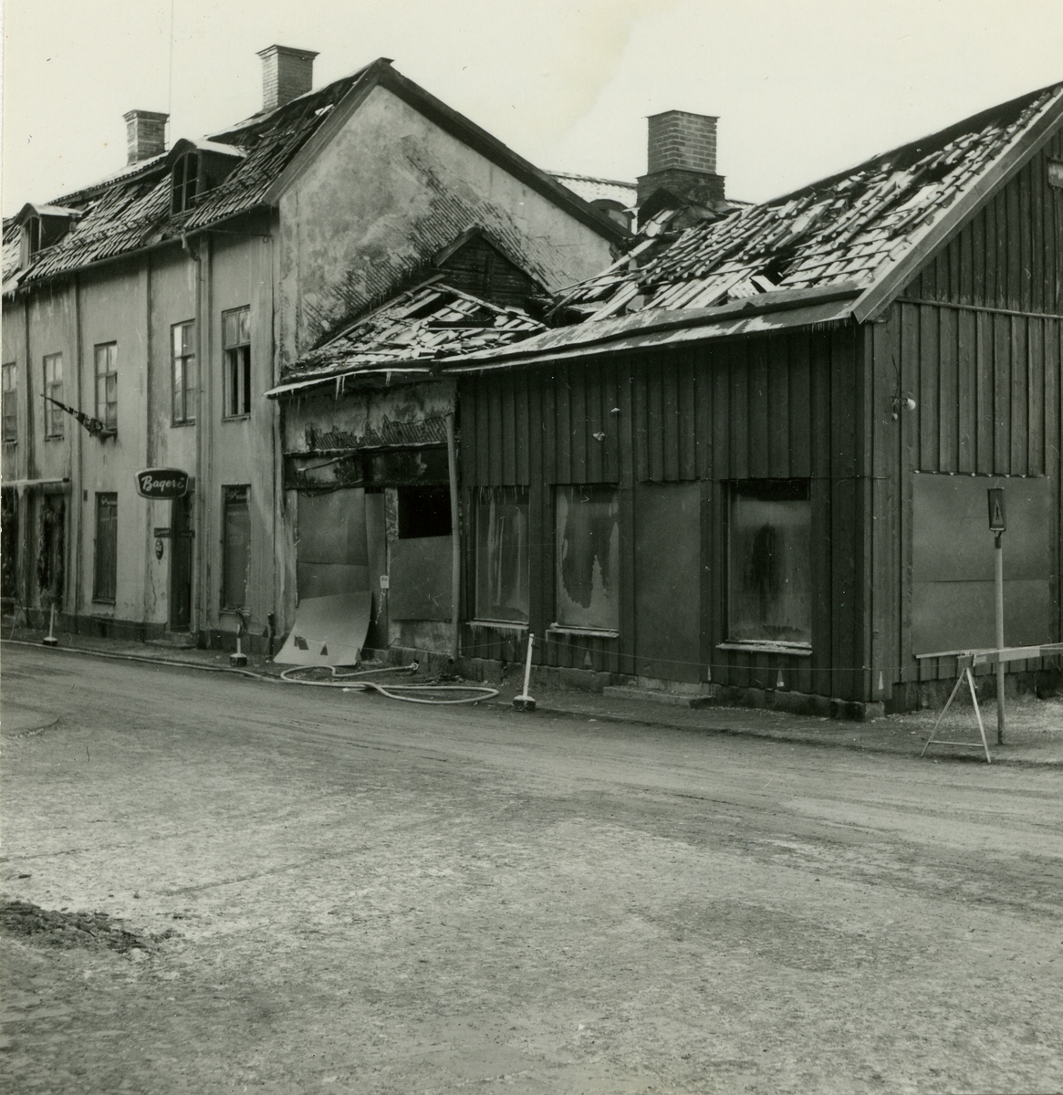 Västerås. Hantverkargatan. Raserad byggnad i hörnet mot Torggatan (brand?). 1963.
