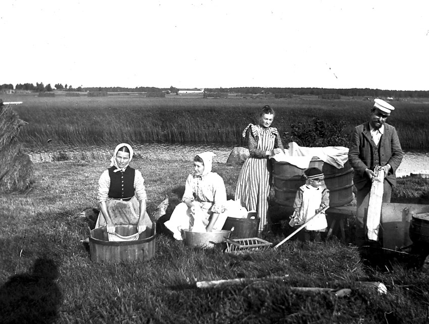 Morbror, moster och jungfrur tvättar utomhus, Bjärby, Västerås.