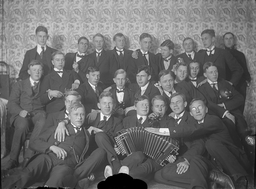 Gruppfoto av unga män. Albert Andersson längst fram.