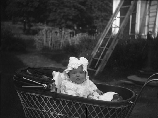 Maja Lindgren i barnvagn i trädgård, Västmanland.