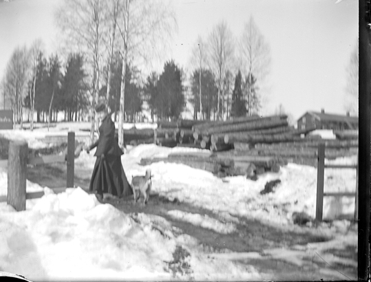 Kvinna med hund i vinterlandskap, Riddarhyttan.