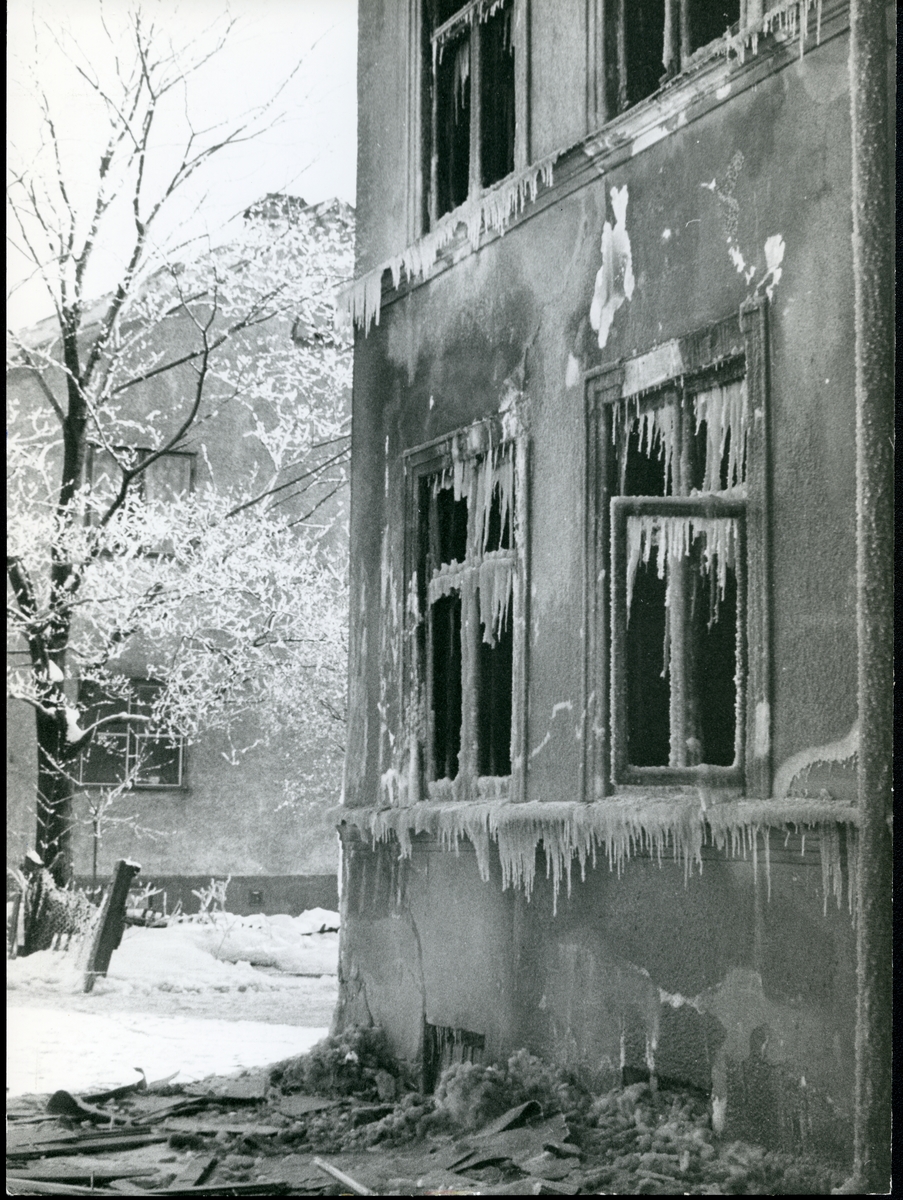 Rivningsbyggnad, hörnet Malmabergsgatan-Lokegatan. Januari 1969.