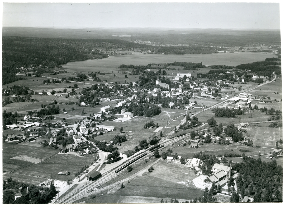 Flygfoto över Norberg, med kyrkan i bakgrunden. 1939.