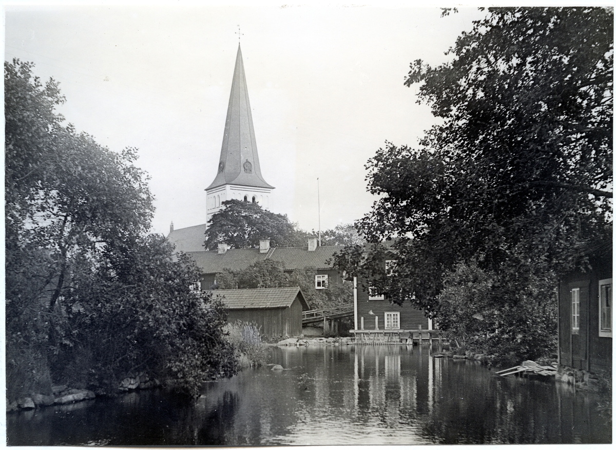 Norbergs kyrka i bakgrunden, med å och byggnader i förgrunden.